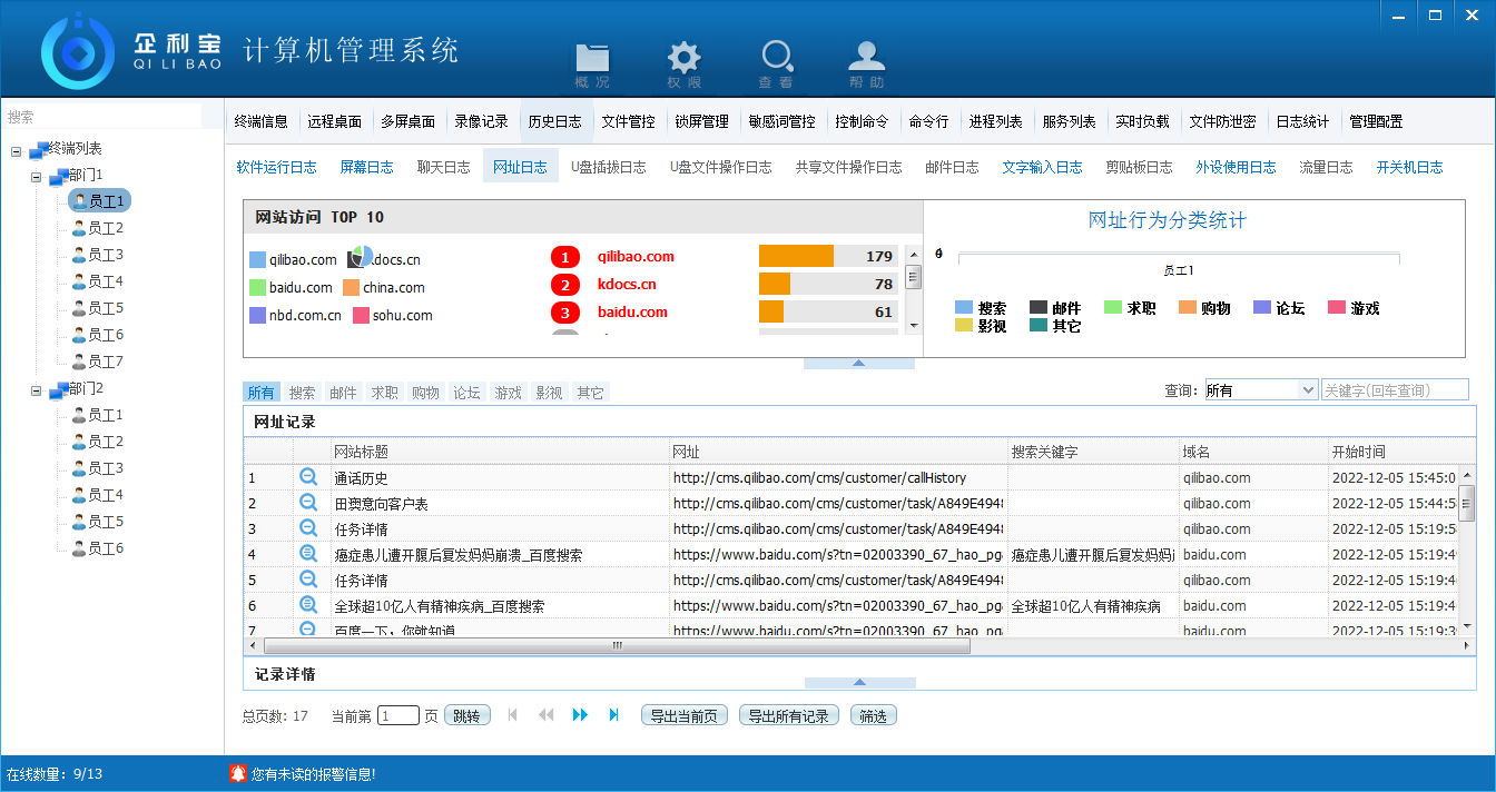 对被控端电脑访问的网址进行管控并记录日志。掌握被控端是否上班时间浏览了与工作无关的网站。